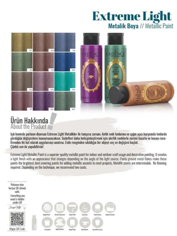 Wysokiej jakości farba na bazie wody do stosowania wewnątrz i na zewnątrz. Nadaje delikatności, wyglądu zdobionych przedmiotów. Ich kolor zmienia się w zależności od kąta padania światła. Najwyższej jakości farba kryjąca nadaje metalicznego akcentu większości zdobionych powierzchni. Farby można mieszać. Nie rozcieńczać. W zależności od stosowanej techniki zaleca się nałożenie 2 warstw. Duży wybór kolorów. Idealna do malowania, nakładania gąbką. Zabrudzenia czyścimy za pomocą mydła i wody. Nie toksyczna. Certyfikowana przez EN 71 i CE