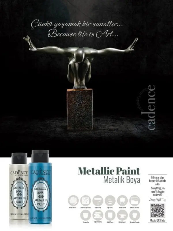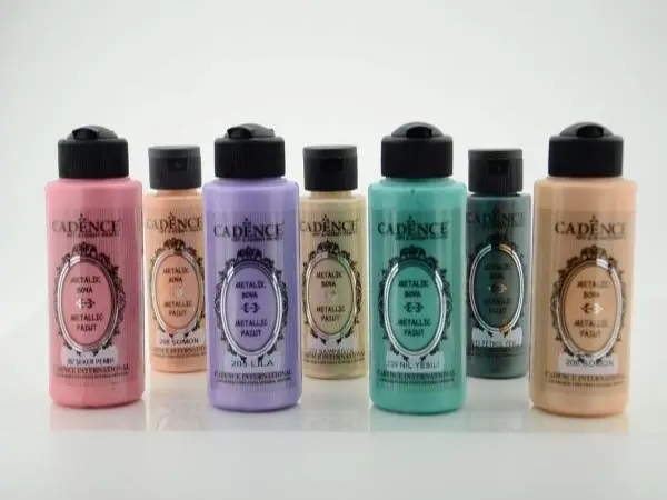 Metaliczna farba akrylowa do dekoracji przedmiotów w środku i na zewnątrz. Farba nadaje metalicznego akcentu zdobionym przedmiotom. Farby dostępne w mocnych metalicznych kolorach od bladych pasteli do głębokich nasyconych kolorów. Farby można mieszać. Nie rozcieńczać. W zależności od stosowanej techniki zaleca się nałożenie 2 warstw. Duży wybór kolorów. Idealnie do malowania pędzlem, nakładania gąbką. Zabrudzenia łatwo zmyć wodą i mydłem. Można stosować na drzewie, styropianie, ścianach, kamieniach, płótnie malarskim, betonie, terakocie, papierze, metalu, ceramice. Nie toksyczna. Certyfikowana przez EN 71 i CE