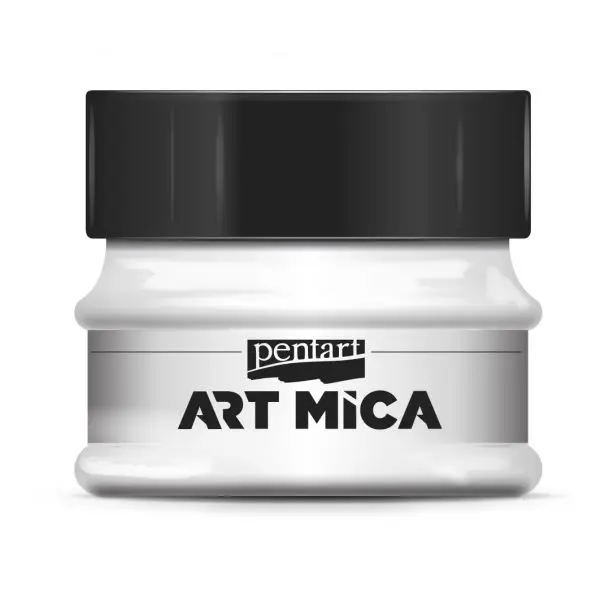 Mika sproszkowana w kolorze białym marki Pentart. Mika w proszku jest to bardzo drobny puder stworzony z naturalnej miki o metalicznym połysku. Można mieszać ją z żywicą, żelem heavy body, lakierem oraz pouring glaze. Ponadto nadaje się również do farb, tuszy, mediów oraz gliny, aby nadać jej wyjątkowy blask. Doskonale współpracuje także z akrylami, olejami, alkoholem, farbami na bazie wody, żywicami epoksydowymi, klejami, gruntami, pastami, lakierami i wieloma innymi mediami.