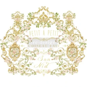 Poznaj wyjątkowy transfer dekoracyjny, który łączy w sobie niepowtarzalny design z elegancją i funkcjonalnością. Inspirowany tapetą do sypialni Marii Antoniny w Wersalu, ten produkt zachwyca olśniewającym złotem, delikatnym różem oraz świeżą zielenią. Urok dodatkowo podkreśla francuskie przysłowie: "Krok po kroku, ptak tworzy swoje gniazdo" (Petit à petit, l'oiseau fait son nid).